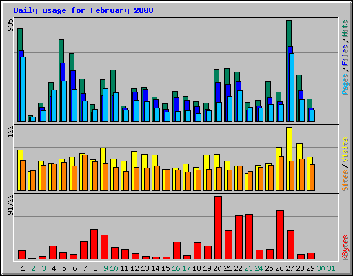 | Day | Hits | Files | Pages | Visits | Sites | KBytes | ||||||